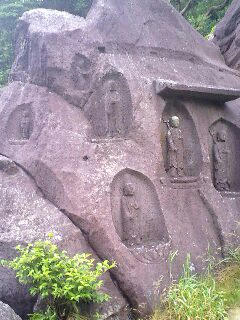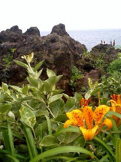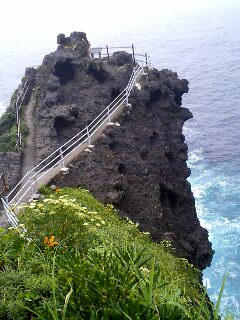 11:58、城ヶ崎着。岸壁がすごい。断崖絶壁に海ツバメが鳴き騒ぎ、オレンジ色の鬼百合(?)も咲いているのが見える。開国後国の防備を図った砲台の跡も残る。