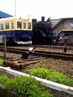 12:41、大井川鉄道新金谷駅着。「新」とつくのに駅舎はボロい。さらに、奥の車庫にはSLが見える。SLがいまだに走る古式ゆかしい大井川線なのである。