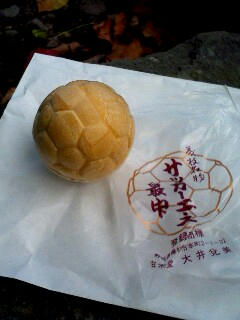 12:57、須賀神社の大クス着。藤枝市内のお菓子屋さんで買ったサッカーエース最中というサッカーボールの形をした最中を食う。