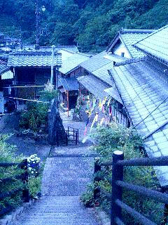 19:01、宇津ノ谷に出る。すでに日は暮れ、辺りは薄暗くなりつつある。宇津ノ谷は岡部宿と丸子宿との間の宿である。小さな集落で雰囲気の良い町である。各家の前に小さなたいまつで火をともしている。不思議に思い、家の前に座っていたおじいさんに尋ねる。「お盆だからねぇ。わしらのとこではどの家もみな7月1日から30日まで毎晩火をともすんだ。」初盆も何も関係なく「どしゃ降りのとき以外は」毎晩だそうだ。また、7月は七夕だから、七夕飾りのついた笹も道沿いにずらりと並ぶ。それに盆のたいまつが加われば壮観である。それで、おじいさんや子どもたちがたぶん毎晩のように家の前に出て、おしゃべりしながらの夕涼み。とても素敵な集落でしょう?