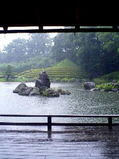 次に、同じく駿府公園内の秋葉山庭園に入る。ここも新たに造られたもの。富士山や三保の松原、それに茶畑など静岡の名所を一つの庭園にまとめてしまってある。庭園内ではお茶を飲むことができ、お煎茶をいただく。とうていお茶の味など分からない身だが、うまいと思う。お茶の味がはっきりある感じ。たぶんお茶の入れ方もいいんだろう。外の雨はまだまだ元気がいい。