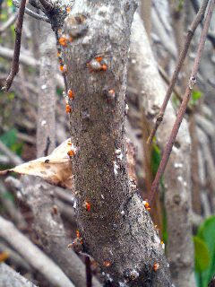 カイガラムシは、普段は白いロウ状の物質で体の周りを覆い外敵から身を守りますが、こんなふうに赤い中身が見えているときは弱く、薬を撒いて防除するならこの時であるそうです。