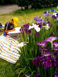 10:23、知立神社着。すぐそばにある知立公園に咲く花しょうぶがすばらしかった。小学生たちがひたすらに絵を描いていた。遊んどるのもおったが。