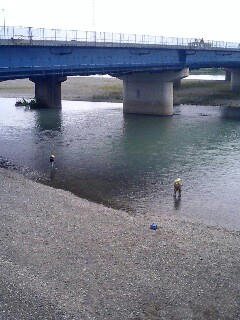13:55、天竜川を渡る。日本三大急流の一つ。釣り人がいる。